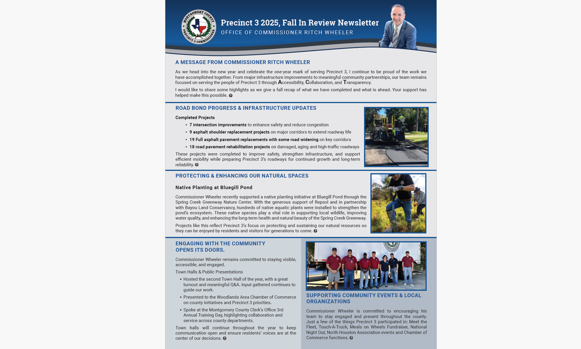 We are committed to promoting Accessibility, Collaboration, and Transparency to serve the residents of Montgomery County Precinct 3 with integrity. Through proactive solutions, we aim to enhance quality of life and address the evolving needs of our community.